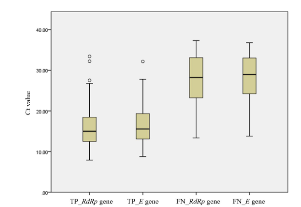 Fig. 1. Box-plots of cycle threshold (Ct) values distributions according to the concordance results between Exdia Ag and Real-Q assays. Solid lines in box-plots represent the Ct value medians, box-plots and whiskers represent the Ct values distribution. Abbreviations: TP, Exdia Ag-positive/Real-Q-positive samples; FN, Exdia Ag-negative/Real-Qpositive samples; RdRp, RNA-dependent RNA polymerase gene; E, envelope gene; Exdia Ag, Exdia COVID-19 antigen; Real-Q, Real-Q 2019-nCoV Detection KIT.