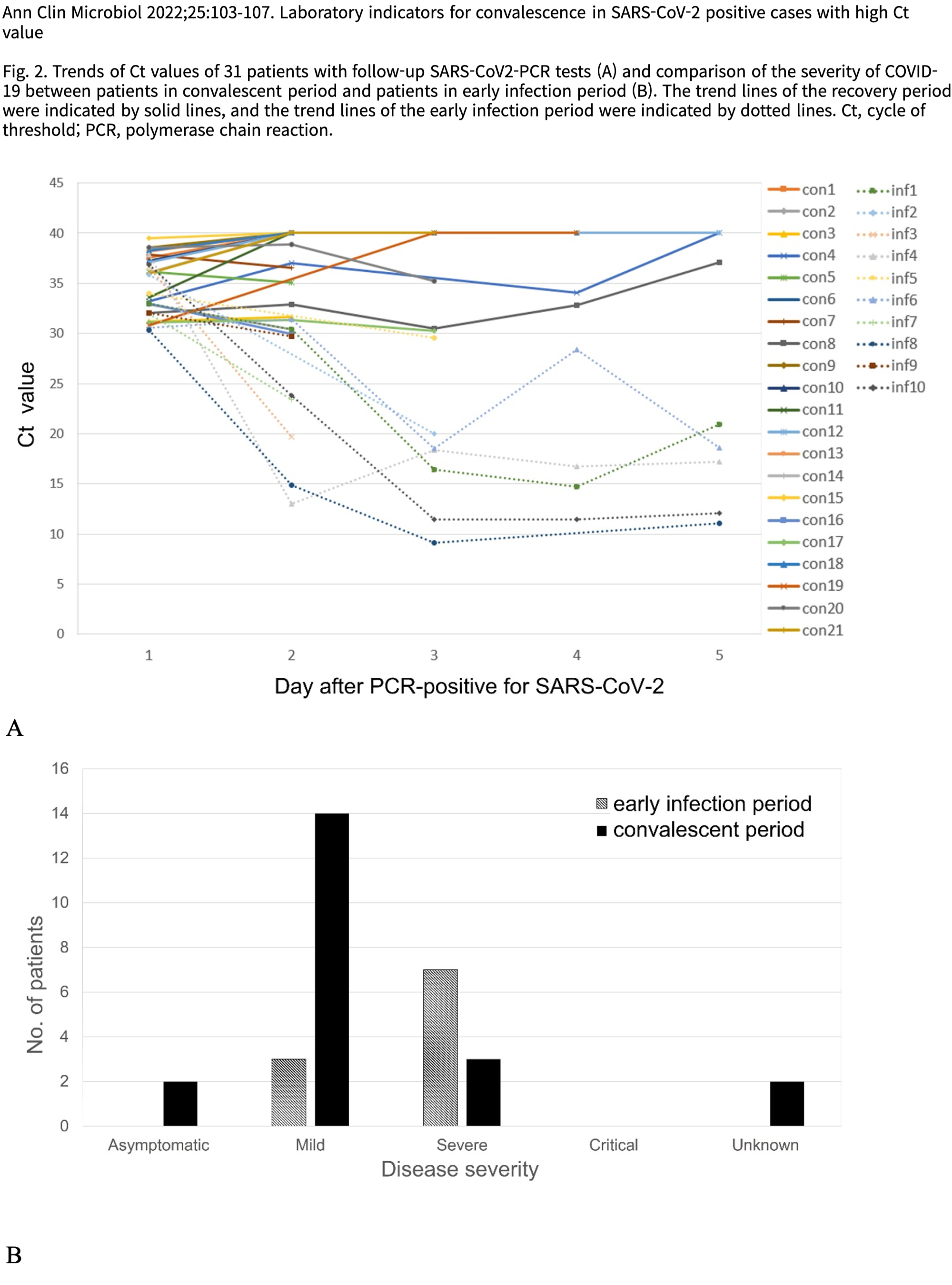 Fig. 2. Trends of Ct values of 31 patients with follow-up SARS-CoV2-PCR tests (A) and comparison of the severity of COVID-19 between patients in convalescent period and patients in early infection period (B). The trend lines of the recovery period were indicated by solid lines, and the trend lines of the early infection period were indicated by dotted lines. Ct, cycle of threshold; PCR, polymerase chain reaction.