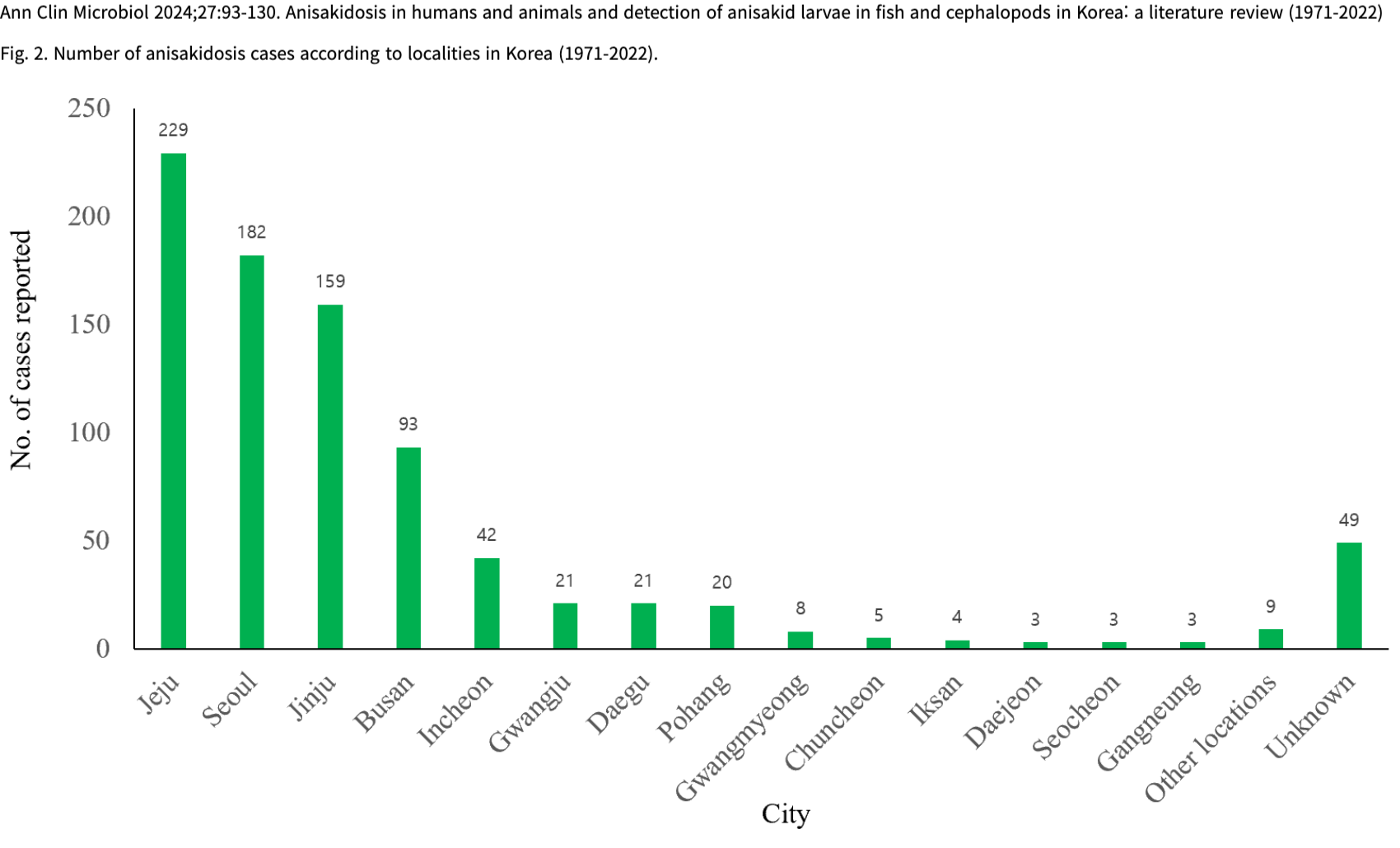 Ann Clin Microbiol 2024;27:93-130. Anisakidosis in humans and animals and detection of anisakid larvae in fish and cephalopods in Korea: a literature review (1971-2022)