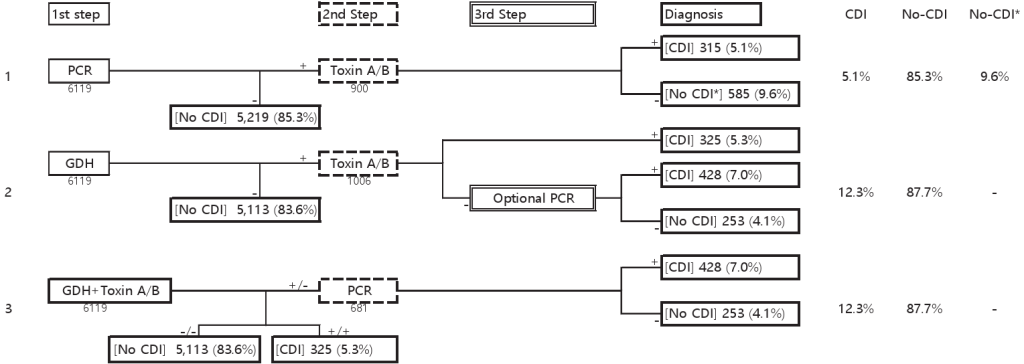 Major guidelines, including those from the European Society of Clinical Microbiology and Infectious Diseases (ESCMID) [2], Infectious Diseases Society of America, Society for Healthcare Epidemiology of America [3], and American College of Gastroenterology (ACG) [4], recommend testing algorithms rather than relying on a single diagnostic test.