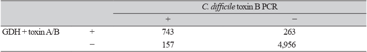 Table 3. Comparison between GDH/toxin EIA test and C. difficile toxin B PCR (N = 6,119)