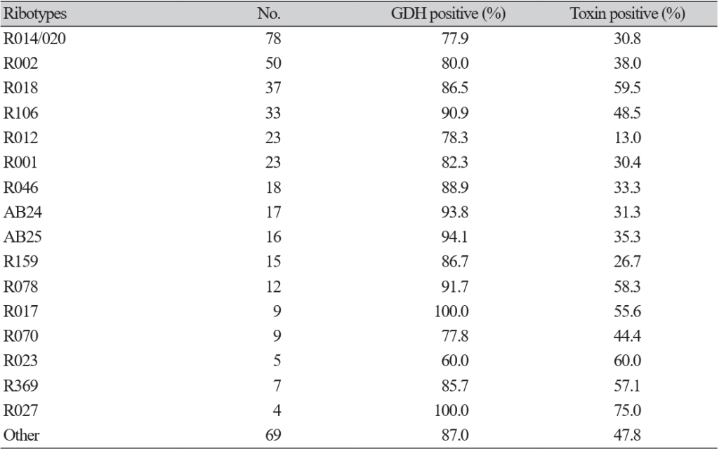 Table 4 presents the GDH and toxin positivity rates according to the PCR ribotypes. Although GDH positivity rates did not differ significantly among ribotypes (P = 0.608), toxin EIA positivity rates differed significantly (P = 0.034).
