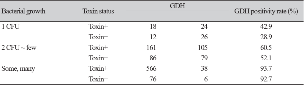 Table 5. Comparison of C. difficile growth in cultured isolates and toxin production status with GDH positivity rate