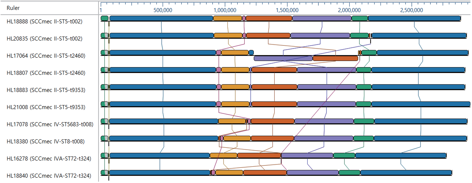 Fig. 1. Genome alignments of MRSA strains using multiple alignment of conserved genomic sequences (MAUVE). Pairwise comparisons of MRSA genome sequences revealed a large genomic inversion in strain HL17064. MRSA: methicillin-resistant Staphylococcus aureus