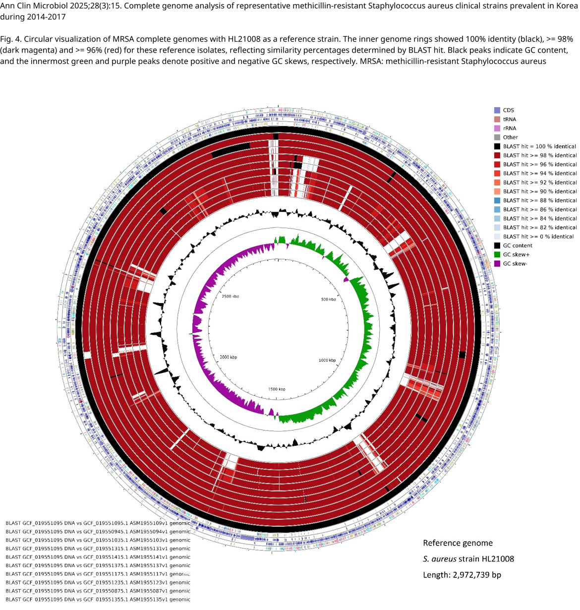 Fig. 4. Circular visualization of MRSA complete genomes with HL21008 as a reference strain. The inner genome rings showed 100% identity (black), >= 98% (dark magenta) and >= 96% (red) for these reference isolates, reflecting similarity percentages determined by BLAST hit. Black peaks indicate GC content, and the innermost green and purple peaks denote positive and negative GC skews, respectively. MRSA: methicillin-resistant Staphylococcus aureus