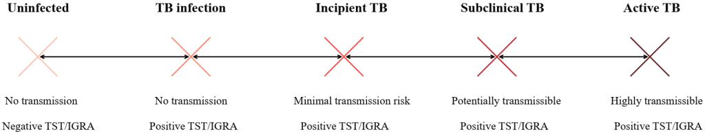 Fig. 1. Schematic representation of the tuberculosis infection continuum in relation to infectivity and immunologic test results. Abbreviations: TB, tuberculosis; TST/IGRA, tuberculin skin test/interferon-gamma release assays