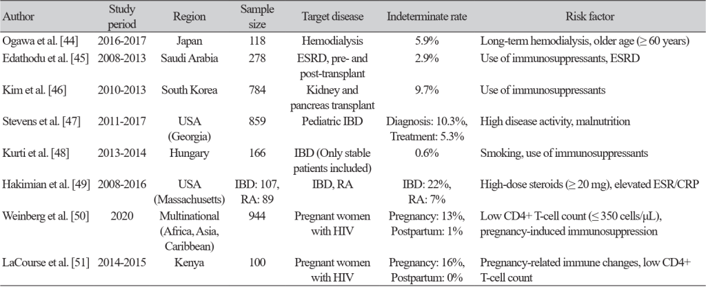 43. Zhou G, Luo S, He J, Chen N, Zhang Y, Cai S, et al. Risk of progression to active tuberculosis for indeterminate interferon-gamma release assay in immunocompromised individuals: a systematic review and meta-analysis. Clin Microbiol Infect 2023;29:1375-84.