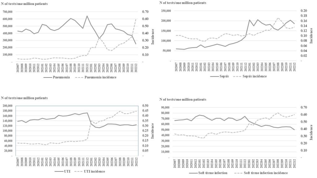 Prescriptions were most frequent among patients with suspected pneumonia, with a peak monthly number of bacterial cultures and ASTs (per one million patients) in December 2021. However, the number of bacterial cultures and ASTs (per one million patients) consistently declined after June 2022, with the lowest levels in December 2022 (Fig. 2A). The number of bacterial cultures and ASTs (per one million patients) peaked after 2022 and plateaued in patients with suspected sepsis (Fig. 2B). Among patients with suspected UTI, the numbers of bacterial cultures and ASTs (per one million patients) dropped sharply after 2022 and reached a plateau thereafter (Fig. 2C). The number of bacterial cultures and ASTs (per one million patients) showed a continuous decrease after 2022 in patients with suspected STI (Fig. 2D).