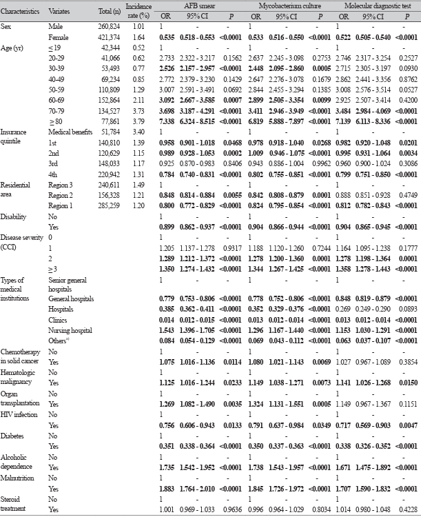 Results: Requests for TB-related and bacterial infection-related tests varied according to multiple factors, including sex, age, insurance quintile, residential area, presence or absence of disability, disease severity, type of medical institution admission, chemotherapy, steroid use, comorbid conditions, and underlying diseases.