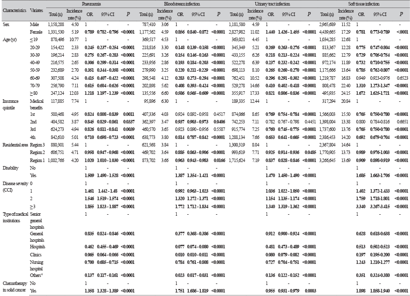 | Characteristics | Variates | Pneumonia | Bloodstream infection | Urinary tract infection | Soft tissue infection | ||||||||||||||||
