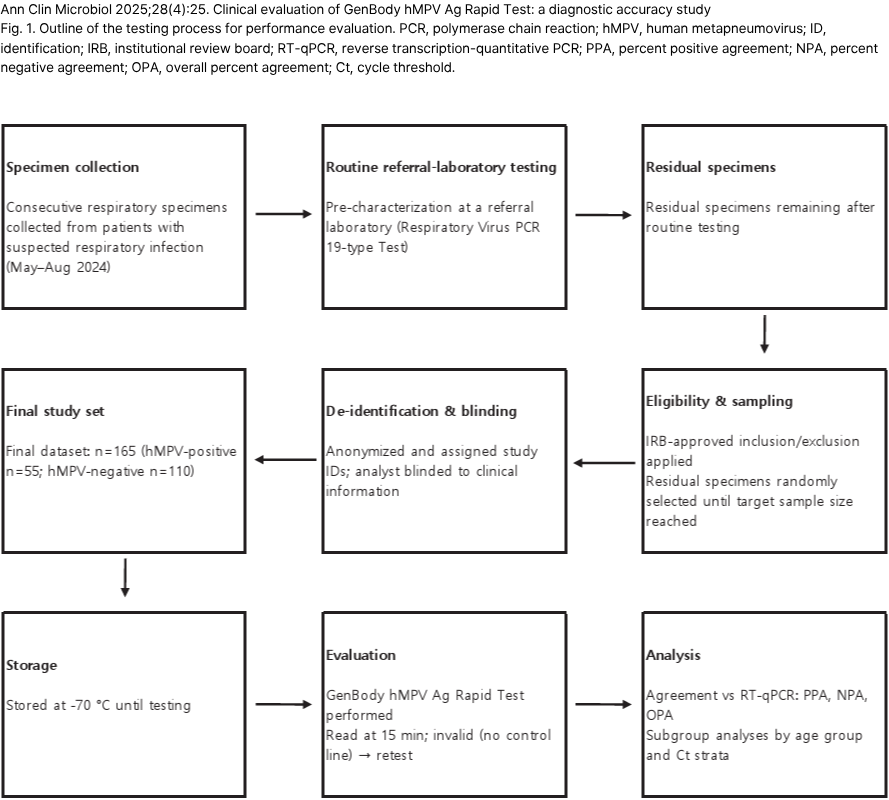 Fig. 1. Outline of the testing process for performance evaluation. PCR, polymerase chain reaction; hMPV, human metapneumovirus; ID, identification; IRB, institutional review board; RT-qPCR, reverse transcription-quantitative PCR; PPA, percent positive agreement; NPA, percent negative agreement; OPA, overall percent agreement; Ct, cycle threshold.