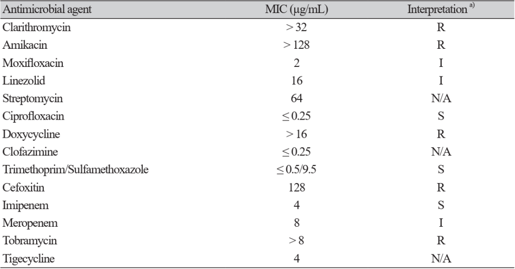 The patient was admitted, and empirical antibiotic therapy—aligned with regimens for rapidly growing mycobacteria—was initiated, comprising azithromycin, clofazimine, amikacin, and imipenem. The symptoms improved dramatically within a few days of therapy initiation, and management was subsequently continued on an outpatient basis. Drug susceptibility testing (DST) was initially attempted with the Sensititre RAPMYCOI plate (Thermo Fisher Scientific) in cation-adjusted Mueller–Hinton broth, but the isolate failed to grow. In line with prior reports on Segniliparus spp., DST was repeated in Middlebrook 7H9 broth (Korean Institute of Tuberculosis, Cheongju, Korea; Table 1). Amikacin was replaced with ciprofloxacin 3 months later, in light of the DST results and the patient’s renal function.