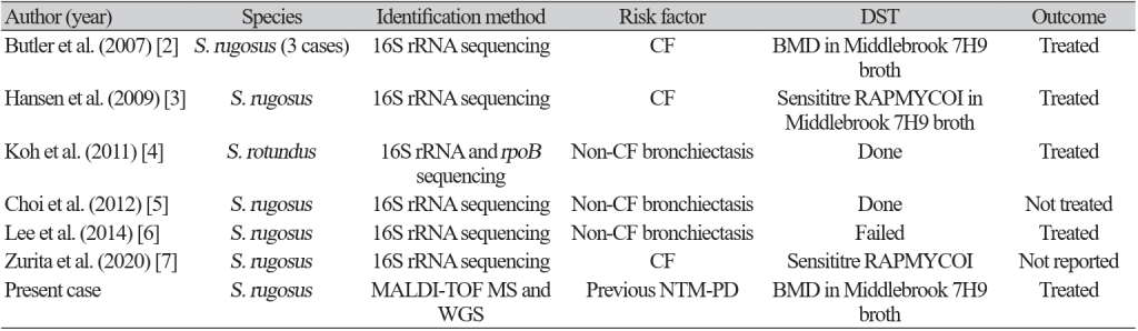 | Present case | S. rugosus | MALDI-TOF MS and WGS | Previous NTM-PD | BMD in Middlebrook 7H9 broth | Treated |
