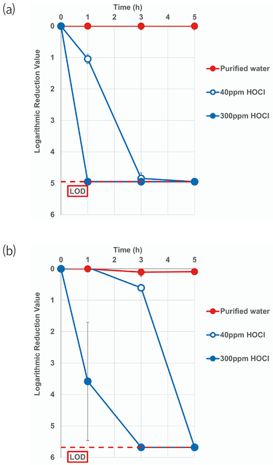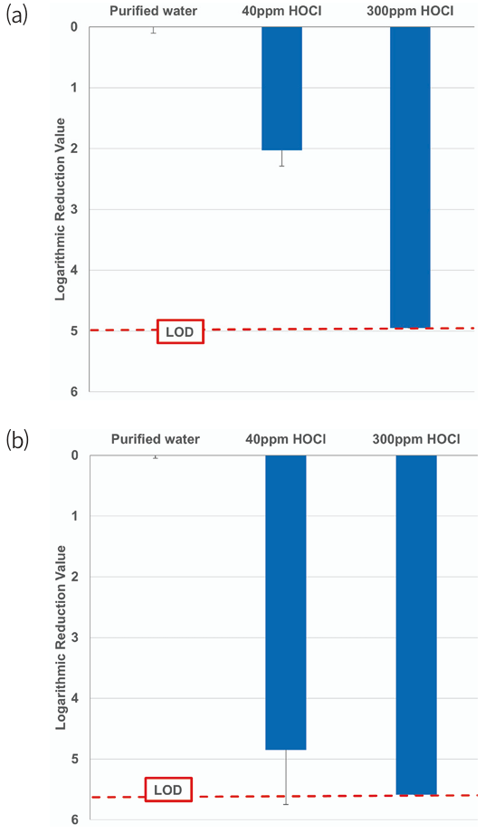 Fig. 3. Logarithmic reduction values of (a) carbapenem-resistant Acinetobacter baumannii (CRAB) and (b) multidrug resistant Pseudomonas aeruginosa (MRPA) after a 5-min exposure to 40 ppm and 300 ppm of sprayed HOCl (n = 3, mean ± SD). Purified water was used as negative control. HOCl, hypochlorous acid water; LOD, limit of detection.